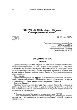 Пленум ЦК КПСС. Июнь 1957 года. Стенографический отчет. 22-29 июня 1957 г. Заседание первое. 22 июня