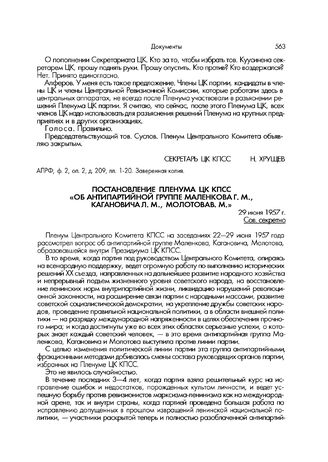 Постановление Пленума ЦК КПСС «Об антипартийной группе Маленкова Г. М., Кагановича Л. М., Молотова В. М.» 29 июня 1957 г. // АПРФ, ф. 2, оп. 2, д. 209, лл. 21-29. Машинописная копия.