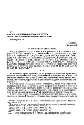 Проект обвинительно заключения по делу «антисоветского право-троцкистского блока». 27 января [1938 г.] // РГАСПИ. Ф. 17. Оп. 171. Д. 330. Л. 114-139. Копия. Машинописный текст с правкой и пометами И.В. Сталина и неизвестного, автограф А.Я. Вышинского.