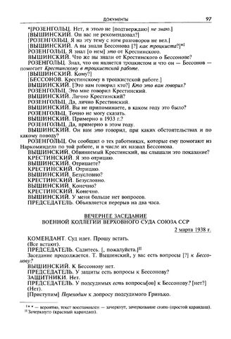 Стенограмма открытого судебного заседания Военной коллегии Верховного суда СССР по делу «антисоветского право-троцкистского блока». 2-12 марта 1938 г. Вечернее заседание 2 марта 1938 г. // РГАСПИ. Ф. 17. Оп. 171. Д. 393—401. Копия. Машинописный текст с рукописной правкой И.Д. Брауде, А.Я. Вышинского, Н.В. Коммодова, Г.К. Рогинского, И.В. Сталина, А.Я. Стецкого.