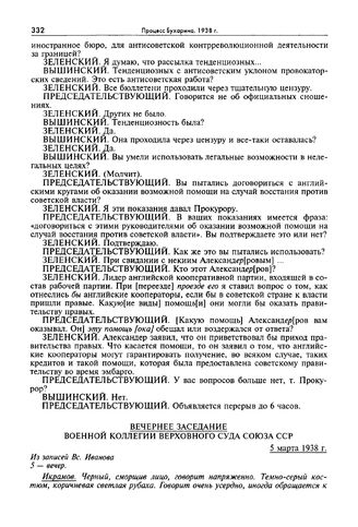 Стенограмма открытого судебного заседания Военной коллегии Верховного суда СССР по делу «антисоветского право-троцкистского блока». 2-12 марта 1938 г. Вечернее заседание 5 марта 1938 г. // РГАСПИ. Ф. 17. Оп. 171. Д. 393—401. Копия. Машинописный текст с рукописной правкой И.Д. Брауде, А.Я. Вышинского, Н.В. Коммодова, Г.К. Рогинского, И.В. Сталина, А.Я. Стецкого.