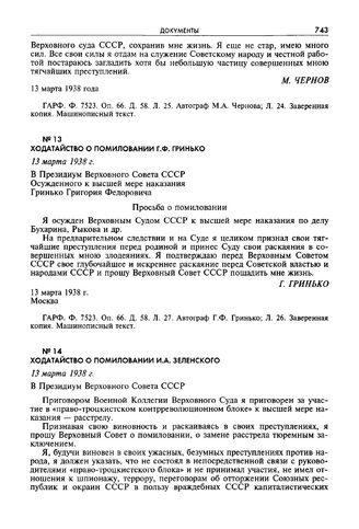 Ходатайство о помиловании И.А. Зеленского. 13 марта 1938 г. // ГАРФ. Ф. 7523. Оп. 66. Д. 30—30 об. Автограф И.А. Зеленского; Л. 28—29. Заверенная копия. Машинописный текст.