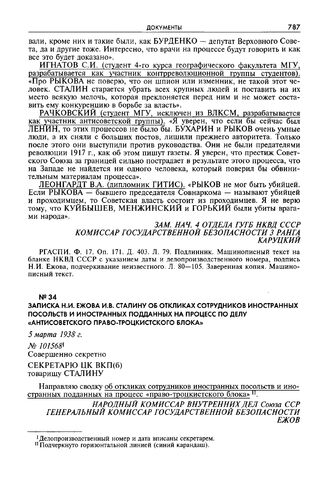 Записка Н.И. Ежова И.В. Сталину об откликах сотрудников иностранных посольств и иностранных подданных на процесс по делу «антисоветского право-троцкистского блока». 5 марта 1938 г.