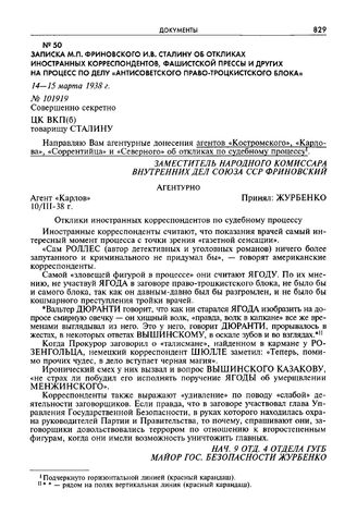 Записка М.П. Фриновского И.В. Сталину об откликах иностранных корреспондентов, фашистской прессы и других на процесс по делу «антисоветского право-троцкистского блока». 14-15 марта 1938 г. // РГАСПИ. Ф. 17. Оп. 171. Д. 403. Л. 229. Подлинник. Машинописный текст на бланке НКВД СССР с указанием даты и делопроизводственного номера, подпись Фриновского, подчеркивание неизвестного. Л. 230—235. Подлинники. Машинописный текст, подпись Журбенко, подчеркивание неизвестного.