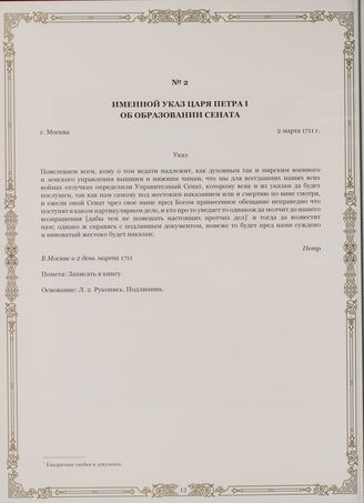Именной указ царя Петра I об образовании Сената. г. Москва, 2 марта 1711 г. // Государственный архив Архангельской области. Ф. 1 (Фонд канцелярии Архангельского губернатора). Оп. 1. Д. 1а. Л. 2. Рукопись. Подлинник.