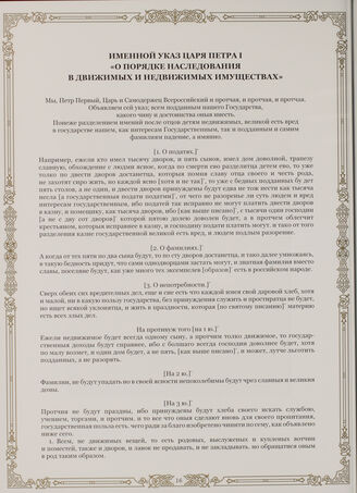 Именной указ царя Петра I «О порядке наследования в движимых и недвижимых имуществах». г. Санкт-Петербург, 24 марта 1714 г.