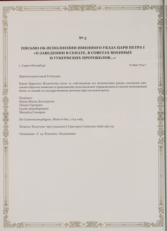 Письмо об исполнении именного указа царя Петра I «О заведении в сенате, в советах военных и губернских протоколов...». г. Санкт-Петербург, 6 мая 1714 г.