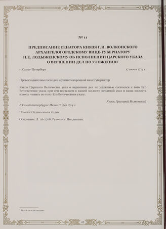 Предписание сенатора князя Г.И. Волконского Архангелогородскому вице-губернатору П.Е. Лодыженскому об исполнении царского указа о вершении дел по уложению. г. Санкт-Петербург, 17 июня 1714 г.