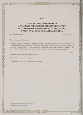 Предписание царя Петра I Архангелогородскому вице-губернатору П.Е. Лодыженскому о невзимании денег с англичан Робинсона и Гарнсайда. г. Санкт-Петербург, 4 апреля 1715 г.
