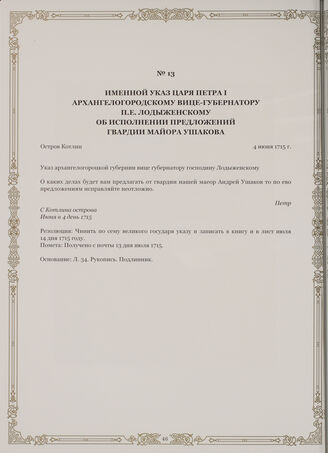 Именной указ царя Петра I Архангелогородскому вице-губернатору П.Е. Лодыженскому об исполнении предложений гвардии майора Ушакова. Остров Котлин, 4 июня 1715 г. // Государственный архив Архангельской области. Ф. 1 (Фонд канцелярии Архангельского губернатора). Оп. 1. Д. 1а. Л. 34. Рукопись. Подлинник.