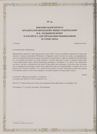 Письмо царя Петра I Архангелогородскому вице-губернатору П.Е. Лодыженскому о расчете с англичанами Робинсоном и Гарнсайда. г. Ревель, 6 августа 1715 г. // Государственный архив Архангельской области. Ф. 1 (Фонд канцелярии Архангельского губернатора). Оп. 1. Д. 1а. Л. 35-35об. Рукопись. Подлинник.