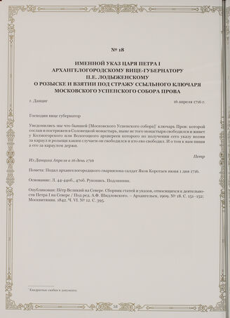 Петр Великий на Севере. Сборник статей и указов, относящихся к деятельности Петра I на Севере / Под ред. А.Ф. Шидловского. - Архангельск, 1909. № 18. С. 151-152.