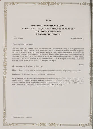 Именной указ царя Петра I Архангелогородскому вице-губернатору П.Е. Лодыженскому о заготовке смолы. г. Амстердам, 21 декабря 1716 г. // Государственный архив Архангельской области. Ф. 1 (Фонд канцелярии Архангельского губернатора). Оп. 1. Д. 1а. Л. 61-61об., 72-72об. Рукопись. Подлинник. Опубликован: Петр Великий на Севере. Сборник статей и указов, относящихся к деятельности Петра I на Севере / Под ред. А.Ф. Шидловского. - Архангельск, 1909. № 23. С. 153-154; Архангельский Север в документах истории (с древнейших времен до 1917 года). Хрестоматия / Под ред. А.А. Куратова. - Архангельск, 2004. № 75. С. 135-136.