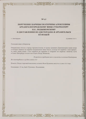 Поручение царицы Екатерины Алексеевны Архангелогородскому вице-губернатору П.Е. Лодыженскому о доставлении из Амстердама в Архангельск ее вещей. г. Амстердам, 23 июня 1717 г.