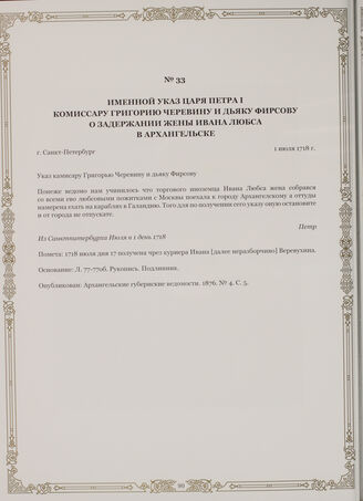 Именной указ царя Петра I комиссару Григорию Черевину и дьяку Фирсову о задержании жены Ивана Любса в Архангельске. г. Санкт-Петербург, 1 июля 1718 г. // Государственный архив Архангельской области. Ф. 1 (Фонд канцелярии Архангельского губернатора). Оп. 1. Д. 1а. Л. 77-77об. Рукопись. Подлинник. Опубликован: Архангельские губернские ведомости. 1876. № 4. С. 5.