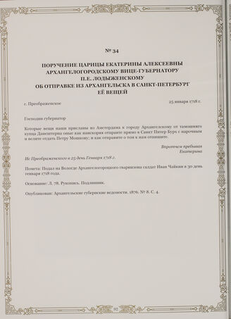 Поручение царицы Екатерины Алексеевны Архангелогородскому вице-губернатору П.Е. Лодыженскому об отправке из Архангельска в Санкт-Петербург ее вещей. с. Преображенское, 25 января 1718 г.