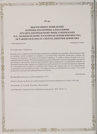 Высочайшее повеление царицы Екатерины Алексеевны Архангелогородскому вице-губернатору П.Е. Лодыженскому о распределении имущества, оставшегося после смерти Дмитрия Борисова. с. Преображенское, 16 февраля 1718 г.