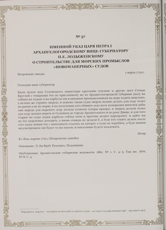 Именной указ царя Петра I Архангелогородскому вице-губернатору П.Е. Лодыженскому о строительстве для морских промыслов «новоманерных» судов. Петровские заводы, 1 марта 1719 г. // Государственный архив Архангельской области. Ф. 1 (Фонд канцелярии Архангельского губернатора). Оп. 1. Д. 1а. Л. 89-89об. Рукопись. Подлинник. Опубликован: Архангельские губернские ведомости. 1861. № 1. С. 4~5; Там же. 1876. № 8. С. 4.