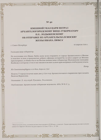 Именной указ царя Петра I Архангелогородскому вице-губернатору П.Е. Лодыженскому об отправке из Архангельска в Москву жены Ивана Любса. г. Санкт-Петербург, 10 апреля 1720 г.