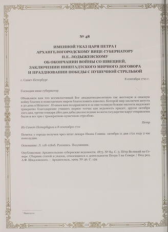 Именной указ царя Петра I Архангелогородскому вице-губернатору П.Е. Лодыженскому об окончании войны со Швецией, заключении Ништадтского мирного договора и праздновании победы с пушечной стрельбой. г. Санкт-Петербург, 8 сентября 1721 г.