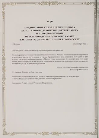 Предписание князя А.Д. Меншикова Архангелогородскому вице-губернатору П.Е. Лодыженскому об освобождении Донского казака Василия Поздеева и отправке его в Москву. г. Москва, 31 декабря 1722 г. // Государственный архив Архангельской области. Ф. 1 (Фонд канцелярии Архангельского губернатора). Оп. 1. Д. 1а. Л. 120-120об. Рукопись. Подлинник.
