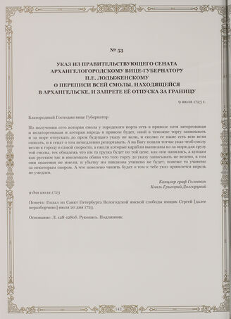 Указ из Правительствующего Сената Архангелогородскому вице-губернатору П.Е. Лодыженскому о переписи всей смолы, находящейся в Архангельске, и запрете ее отпуска за границу. 9 июля 1723 г. // Государственный архив Архангельской области. Ф. 1 (Фонд канцелярии Архангельского губернатора). Оп. 1. Д. 1а. Л. 128-128об. Рукопись. Подлинник.