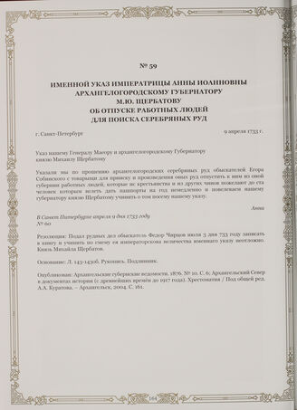 Именной указ императрицы Анны Иоанновны Архангелогородскому губернатору М.Ю. Щербатову об отпуске работных людей для поиска серебряных руд. г. Санкт-Петербург, 9 апреля 1733 г.