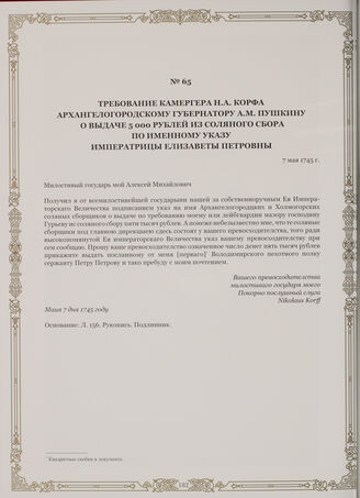 Требование камергера Н.А. Корфа Архангелогородскому губернатору А.М. Пушкину о выдаче 5 000 рублей из соляного сбора по именному указу императрицы Елизаветы Петровны. 7 мая 1745 г. // Государственный архив Архангельской области. Ф. 1 (Фонд канцелярии Архангельского губернатора). Оп. 1. Д. 1а. Л. 156. Рукопись. Подлинник.