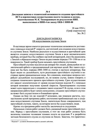 Докладная записка о технической возможности создания простейшего ИСЗ и перспективах осуществления полета человека в космос, подготовленная М.К. Тихонравовым по результатам НИР, выполненных в НИИ-4 по заказу ОКБ-1 НИИ-88. 26 мая 1954 г.