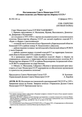 Постановление Совета Министров СССР «О новом полигоне для Министерства обороны СССР». № 292-181 сс. 12 февраля 1955 г. // АП РФ. Ф. 93. Коллекция постановлений и распоряжений СМ СССР за 1955 г. Заверенная копия на бланке.