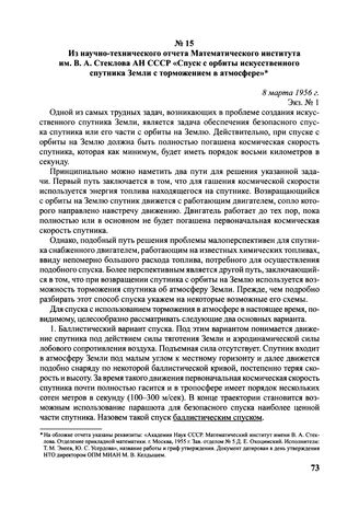 Из научно-технического отчета Математического института им. В.А. Стеклова АН СССР «Спуск с орбиты искусственного спутника Земли с торможением в атмосфере». 8 марта 1956 г.
