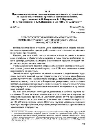 Предложение о создании специализированного научного учреждения по медикобиологическим проблемам космических полетов, представленное А.Н. Бакулевым, В.В. Париным, В.Н. Черниговским и В.И. Яздовским в ЦК КПСС Н.С. Хрущеву. № 0291сс. 8 июня 1958 г. // АП РФ. Ф. 3. Оп. 78. Д. 1051. Л. 15-21. Заверенная копия.