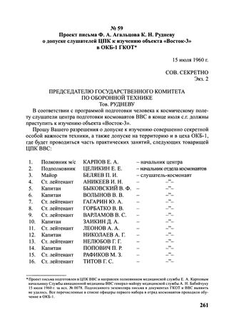 Проект письма Ф.А. Агальцова К.Н. Рудневу о допуске слушателей ЦПК к изучению объекта «Восток-3» в ОКБ-1 ГКОТ. 15 июля 1960 г. // ЦА МО. Ф. 83140. Оп. 4. Д. 1. Л. 9-10.