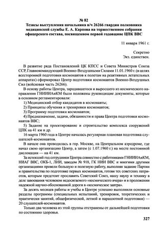Тезисы выступления начальника в/ч 26266 гвардии полковника медицинской службы Е.А. Карпова на торжественном собрании офицерского состава, посвященном первой годовщине ЦПК ВВС. 11 января 1961 г.