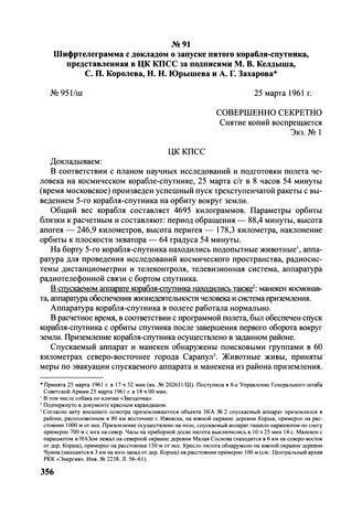 Шифртелеграмма с докладом о запуске пятого корабля-спутника, представленная в ЦК КПСС за подписями М.В. Келдыша, С.П. Королева, Н.Н. Юрышева и А.Г. Захарова. № 951/ш. 25 марта 1961 г. // АП РФ. Ф. 3. Оп. 47. Д. 278. Л. 29-31. Расшифрованный текст.