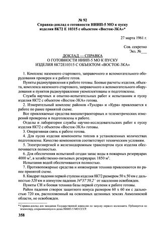 Справка-доклад о готовности НИИП-5 МО к пуску изделия 8К72 Е 10315 с объектом «Восток-ЗКА». 27 марта 1961 г.