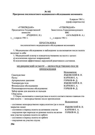 Программа послеполетного медицинского обследования космонавта. 8 апреля 1961 г. // Центральный архив РКК «Энергия». Арх. 2239. Л. 11-13. Копия. Подписи — автографы.