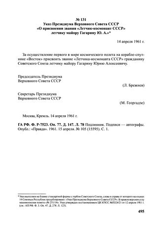 Указ Президиума Верховного Совета СССР «О присвоении звания «Летчик-космонавт СССР» летчику майору Гагарину Ю.А.». 14 апреля 1961 г.
