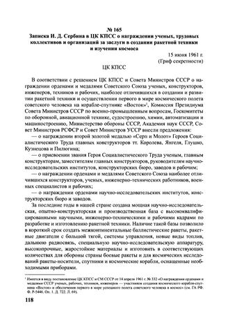 Записка И. Сербина в ЦК КПСС о награждении ученых, трудовых коллективов и организаций за заслуги в создании ракетной техники и изучении космоса. 15 июня 1961 г. // АП РФ. Ф. 3. Оп. 53. Д. 325. Л. 109-111. Копия.