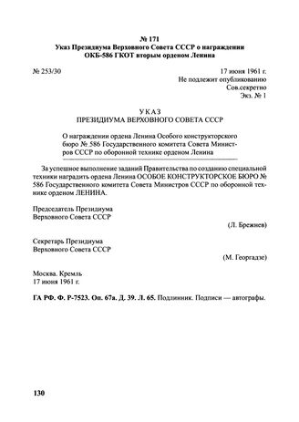 Указ Президиума Верховного Совета СССР о награждении ОКБ-586 ГКОТ вторым орденом Ленина. № 253/30. 17 июня 1961 г. // ГА РФ. Ф. Р-7523. Оп. 67а. Д. 39. Л. 65. Подлинник. Подписи — автографы.