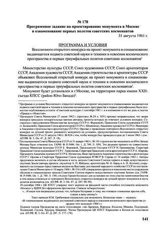 Программное задание на проектирование монумента в Москве в ознаменование первых полетов советских космонавтов 31 августа 1961 г. // АП РФ. Ф. 3. Оп. 47. Д. 286. Л. 136-138. Подлинник.