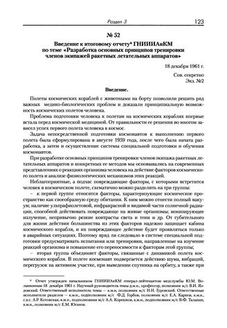 Введение к итоговому отчету ГНИИИАиКМ по теме «Разработка основных принципов тренировки членов экипажей ракетных летательных аппаратов». 18 декабря 1961 г.