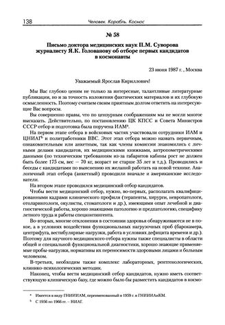 Письмо доктора медицинских наук П.М. Суворова журналисту Я.К. Голованову об отборе первых кандидатов в космонавты. Москва. 23 июня 1987 г.