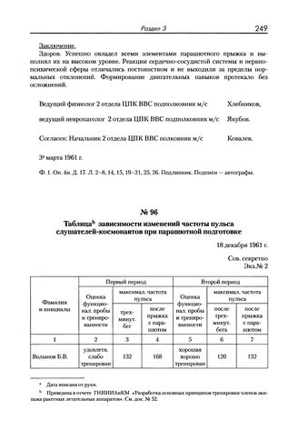 Таблица зависимости изменений частоты пульса слушателей-космонавтов при парашютной подготовке. 18 декабря 1961 г.