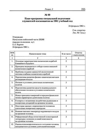 План-программа специальной подготовки слушателей-космонавтов на 1961 учебный год. 24 февраля 1961 г. // Ф. 1. Оп. 1. Д. 1. Л. 41-43. Подлинник. Подписи-автографы.