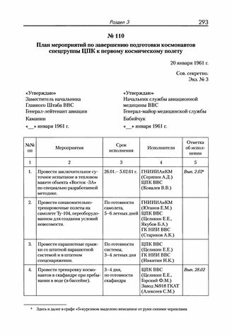 План мероприятий по завершению подготовки космонавтов спецгруппы ЦПК к первому космическому полету. 20 января 1961 г.