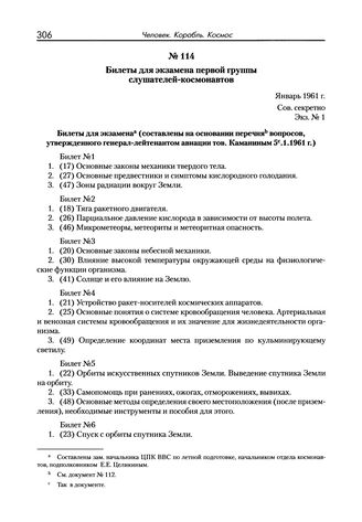 Билеты для экзамена первой группы слушателей-космонавтов. Январь 1961 г.