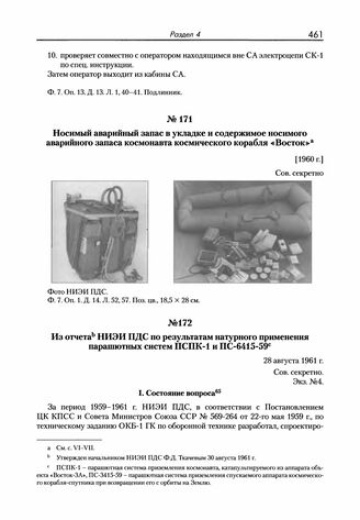 Из отчета НИЭИ ПДС по результатам натурного применения парашютных систем ПСПК-1 и ПС-6415-59С. 28 августа 1961 г. // Ф. 5. Оп. 1н. Д. 8. Л. 3-10, 13-17, 20-26, 29, 30, 32, 35, 37, 39-49, 51-53, 55, 56, 61, 62 Подлинник.