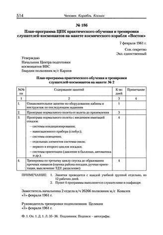 План-программа ЦПК практического обучения и тренировки слушателей-космонавтов на макете космического корабля «Восток». 7 февраля 1961 г.