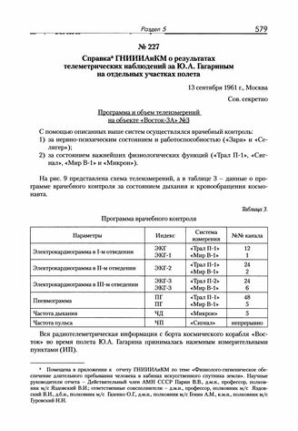 Справка ГНИИИАиКМ о результатах телеметрических наблюдений за Ю.А. Гагариным на отдельных участках полета. 13 сентября 1961 г. // Ф. 14. Оп. 1. Д. 18. Л. 199-202, 225-233, 303-304, 321-323. Подлинник.